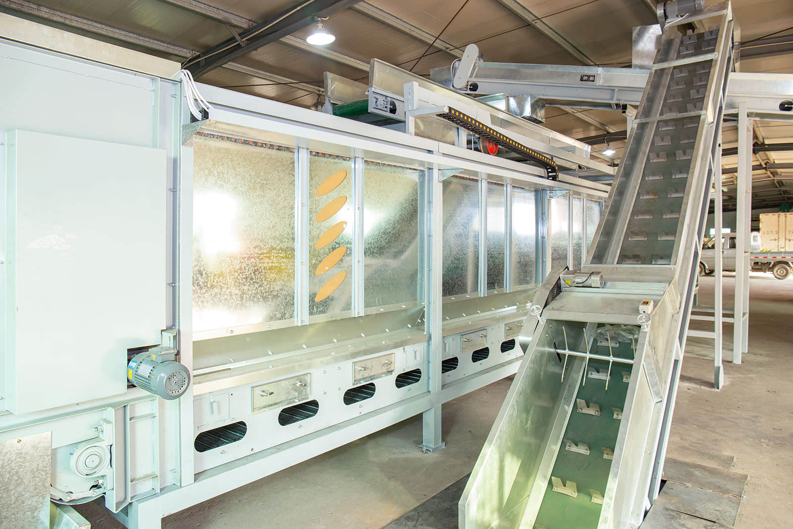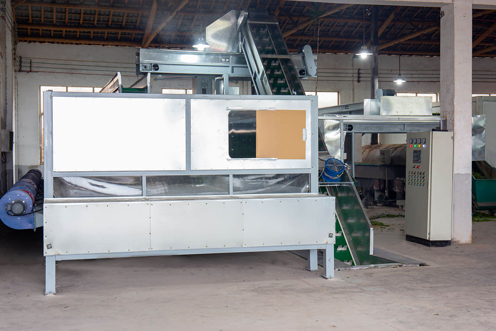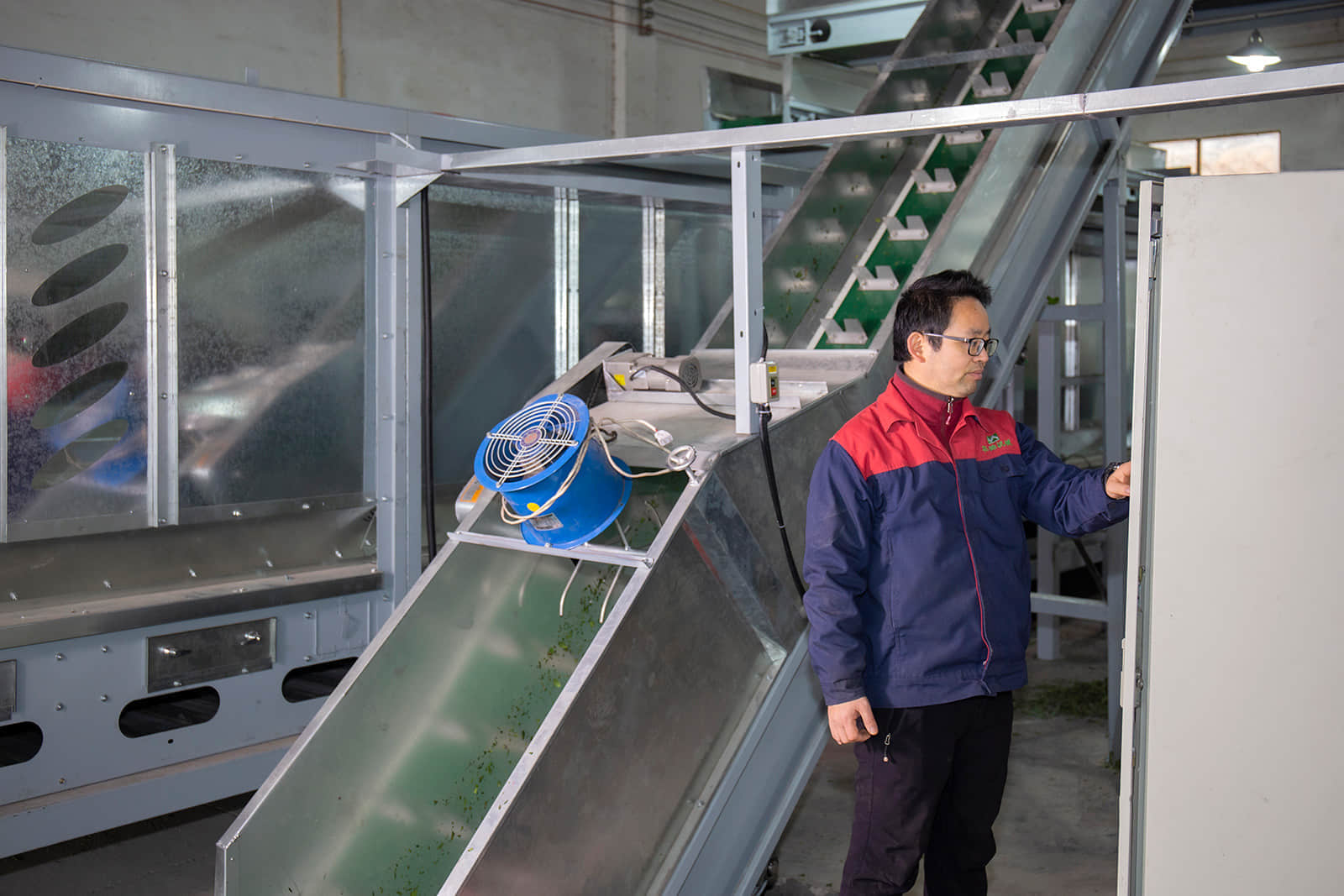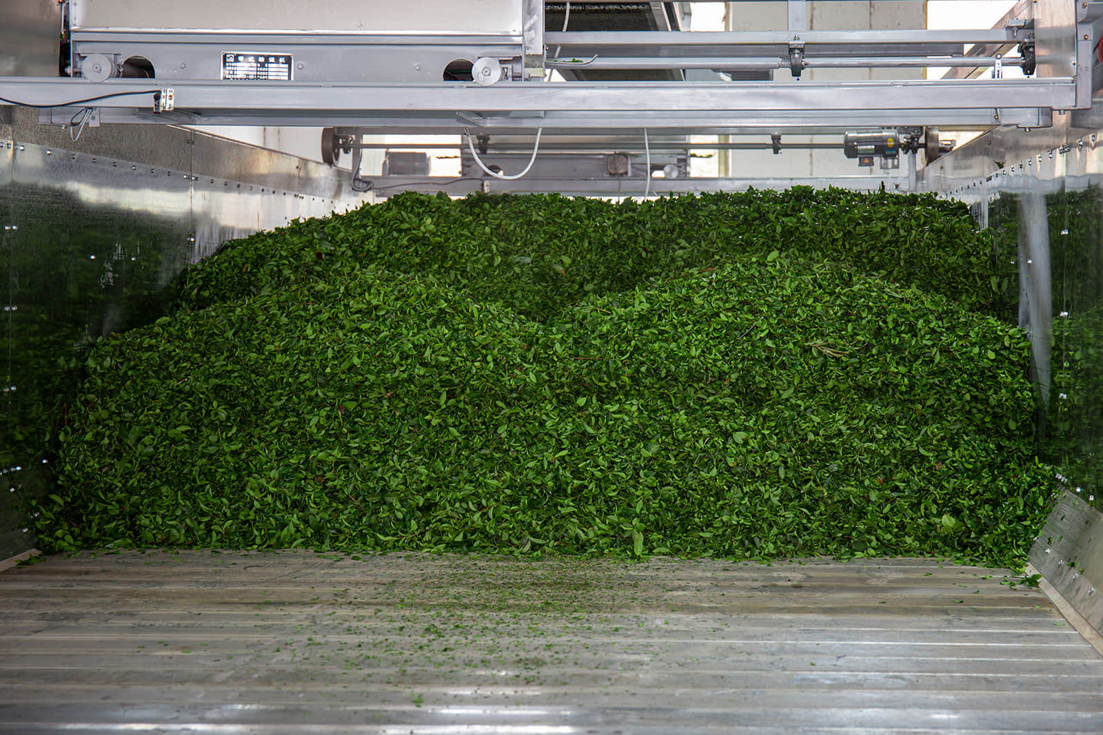 鮮葉貯青機(jī)的輸送帶全部采用食品級(jí)塑膠帶,貯青箱體內(nèi)多處裝有紅外感應(yīng)探頭,可保證儲(chǔ)青機(jī)的進(jìn)葉和攤放均勻。當(dāng)自動(dòng)輸送帶將機(jī)采鮮葉均勻地輸送到儲(chǔ)青機(jī)內(nèi)時(shí),箱體底部12臺(tái)電腦自動(dòng)控制的冷卻風(fēng)機(jī)便均勻?qū)︴r葉吹風(fēng),從而避免鮮葉發(fā)熱變質(zhì)。風(fēng)機(jī)自動(dòng)啟、停間的隔時(shí)間可任意設(shè)置,以滿足不同類型鮮葉的攤涼需求。