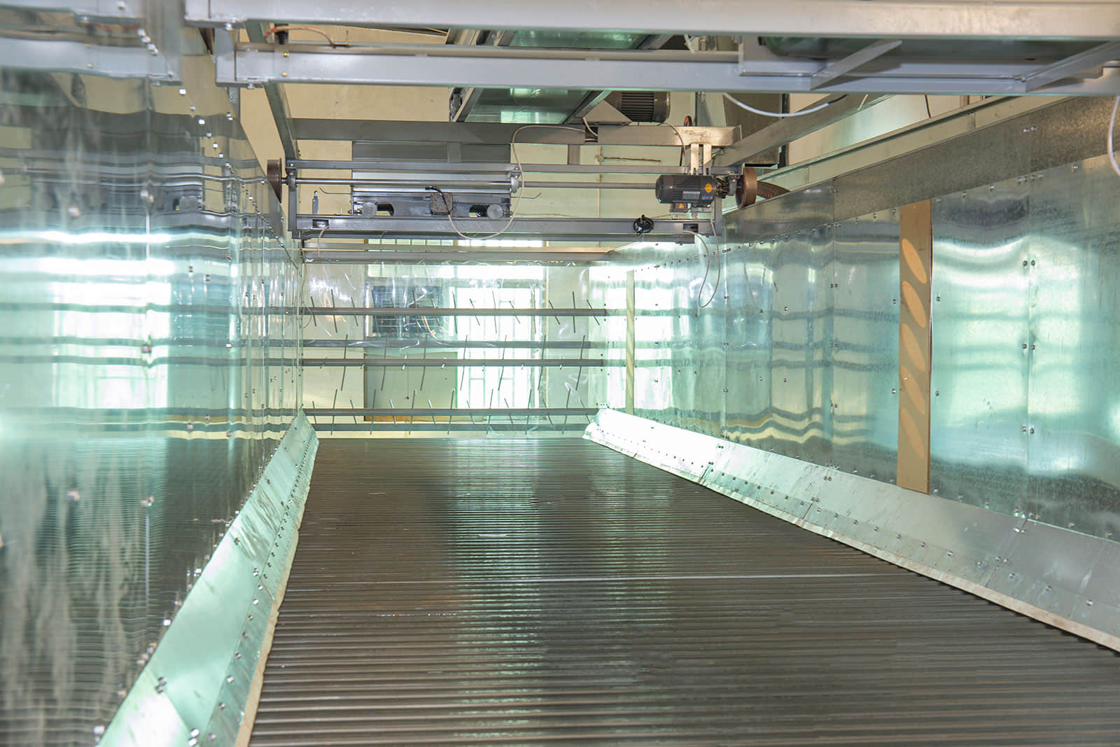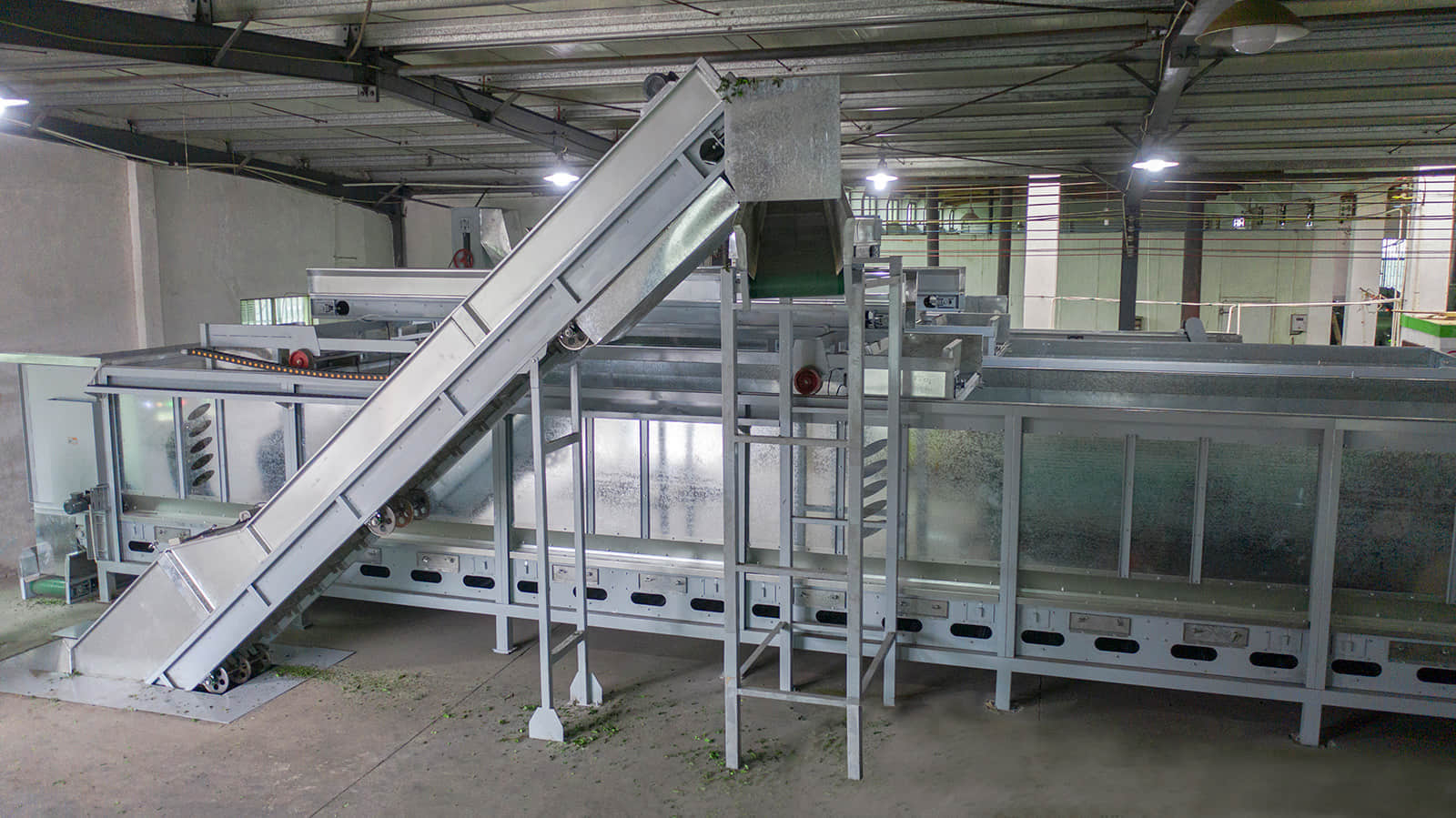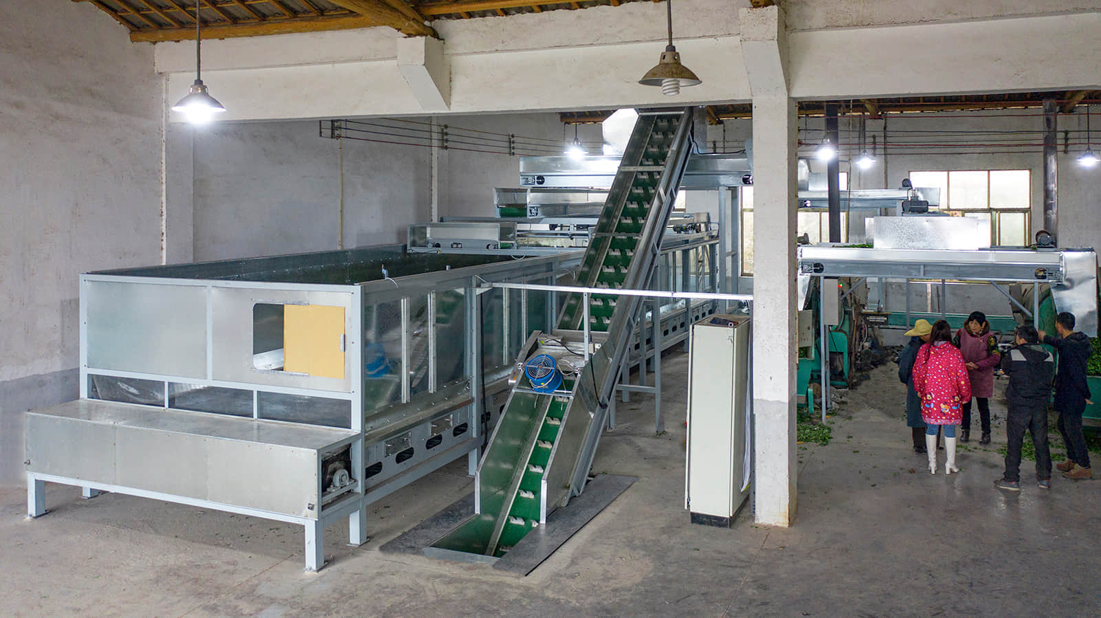 鮮葉貯青機(jī)的輸送帶全部采用食品級(jí)塑膠帶,貯青箱體內(nèi)多處裝有紅外感應(yīng)探頭,可保證儲(chǔ)青機(jī)的進(jìn)葉和攤放均勻。當(dāng)自動(dòng)輸送帶將機(jī)采鮮葉均勻地輸送到儲(chǔ)青機(jī)內(nèi)時(shí),箱體底部12臺(tái)電腦自動(dòng)控制的冷卻風(fēng)機(jī)便均勻?qū)︴r葉吹風(fēng),從而避免鮮葉發(fā)熱變質(zhì)。風(fēng)機(jī)自動(dòng)啟、停間的隔時(shí)間可任意設(shè)置,以滿足不同類型鮮葉的攤涼需求。