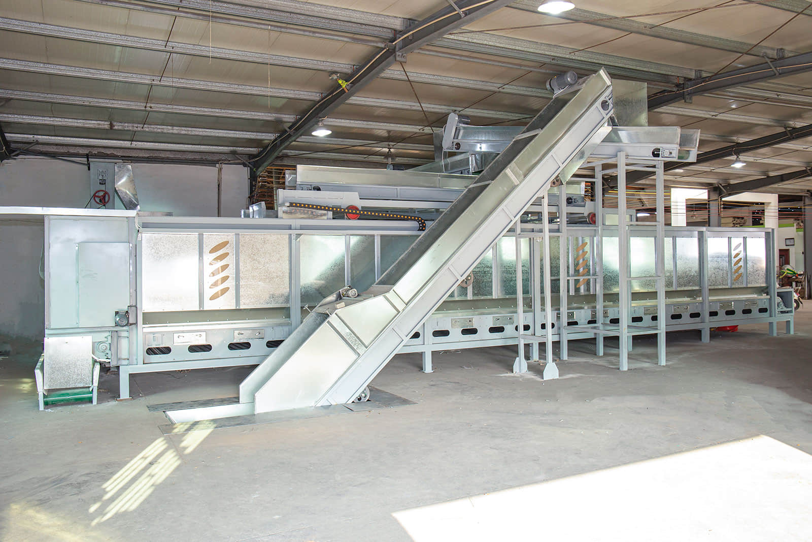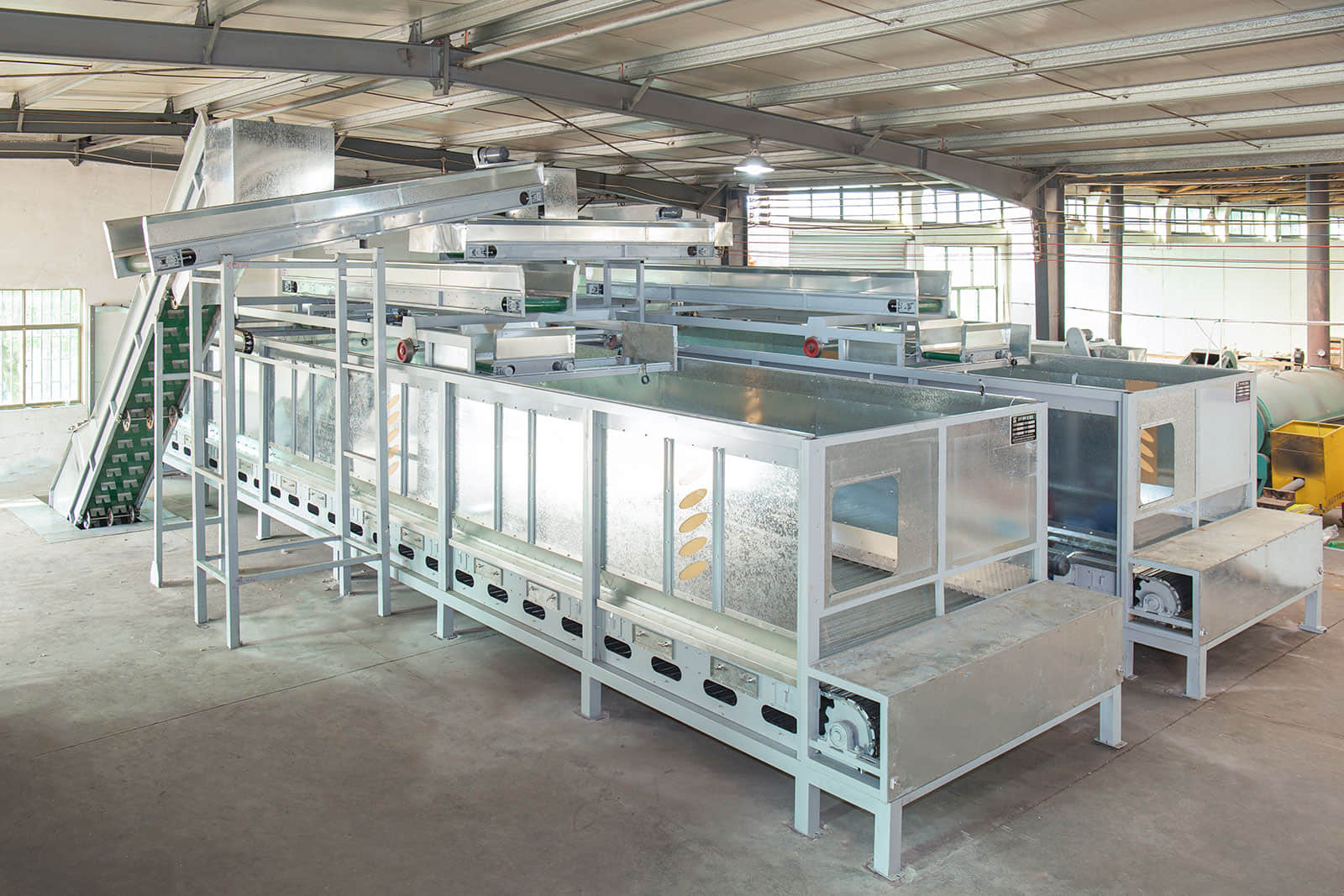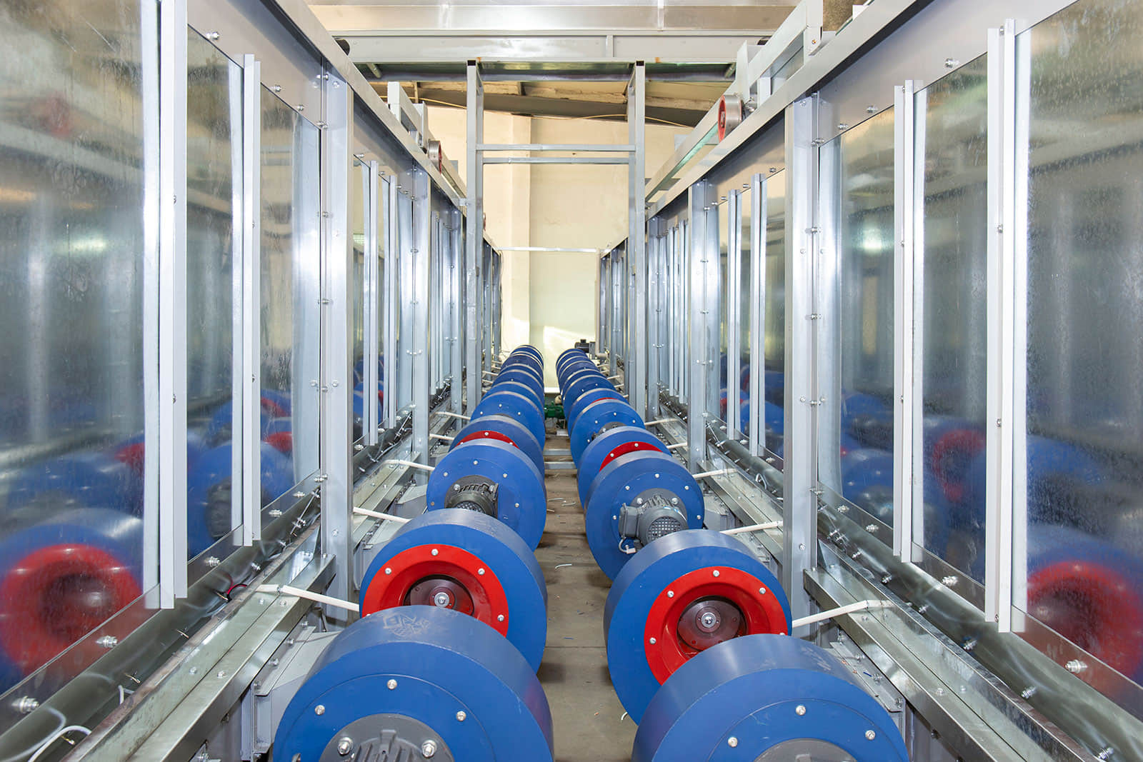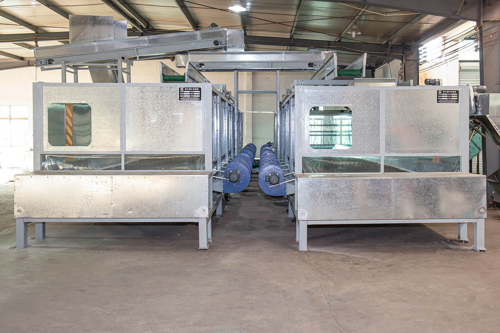 鮮葉貯青機(jī)的輸送帶全部采用食品級(jí)塑膠帶,貯青箱體內(nèi)多處裝有紅外感應(yīng)探頭,可保證儲(chǔ)青機(jī)的進(jìn)葉和攤放均勻。當(dāng)自動(dòng)輸送帶將機(jī)采鮮葉均勻地輸送到儲(chǔ)青機(jī)內(nèi)時(shí),箱體底部12臺(tái)電腦自動(dòng)控制的冷卻風(fēng)機(jī)便均勻?qū)︴r葉吹風(fēng),從而避免鮮葉發(fā)熱變質(zhì)。風(fēng)機(jī)自動(dòng)啟、停間的隔時(shí)間可任意設(shè)置,以滿足不同類型鮮葉的攤涼需求。